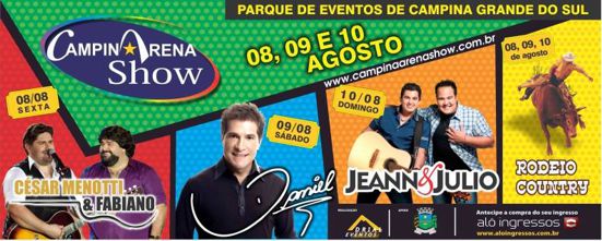 Campina Grande do Sul recebe no final de semana entre os dias 08 e 10 de agosto o Campina Arena Show. Está será a primeira edição do evento, que acontece no Parque de Eventos da cidade e promete trazer grandes atrações do universo sertanejo, entre elas a dupla César Menotti & Fabiano, Jeann & Julio e o cantor Daniel. O Campina Arena Show conta ainda com o Rodeio Country em touros, e terá etapas acontecendo durante os três dias de evento. Outro diferencial que promete conquistar toda a família é o parque de diversões, que segundo a organização do Campina Arena Show, é o maior já montado em Campina Grande do Sul.