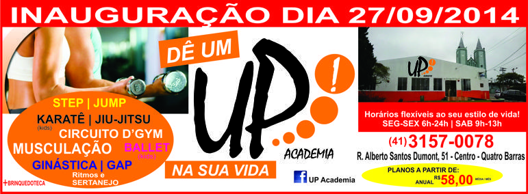 QUATRO BARRAS – Evento imperdível neste sábado (27), os empresários Nilton Eduardo Presa e Caio Tolardo celebram a inauguração a UP Academia em Quatro Barras. A academia que conta com um espaço amplo e agradável é a mais nova opção para quem quer entrar em forma e melhorar ainda mais a qualidade de vida. Localizada no Centro de Quatro Barras na Rua Alberto Santos Dumont, 51 (ao lado da Paróquia São Sebastião) – o telefone para contato é (41) 3157-0078. A inauguração acontece das 14h às 18h. Vale a pena conferir!