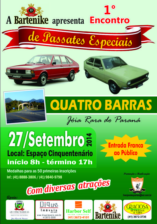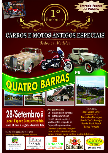 QUATRO BARRAS – Dois eventos ligados ao segmento de carros antigos já têm data e local definidos para acontecer. No próximo dia 27 de setembro, Quatro Barras recebe o 1º Encontro de Passates Especiais, das 8h às 17h no Espaço Cinquentenário, ao lado do Sesi. No dia 28 é a vez do 1º Encontro de Carros e Motos Antigos Especiais, que acontece no mesmo local das 9h às 17h, prometendo muitas atrações.