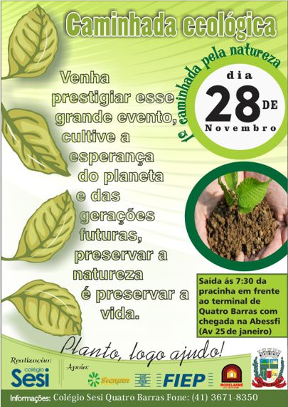 Nesta sexta-feira (28), o Colégio SESI, em parceria com a Prefeitura de Quatro Barras, Sicredi, Sistema FIEP e Modelarme, promovem a 1ª Caminhada pela Natureza, que chama a atenção para a preservação do meio ambiente e a importância histórica e cultural da Estrada da Graciosa. A saída será na Praça 9 de Novembro, ao lado do Terminal Rodoviário, às 7h30. De lá, os participantes seguem até a Abessfi, na Avenida 25 de Janeiro (no traçado da Estrada da Graciosa), onde haverá plantio de mudas nativas. Mais informações sobre o evento podem ser obtidas pelo telefone: (41) 3671-8350.