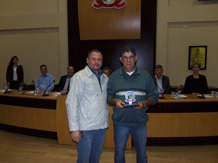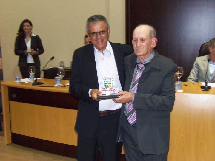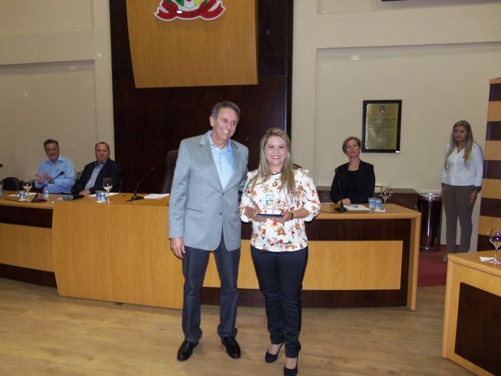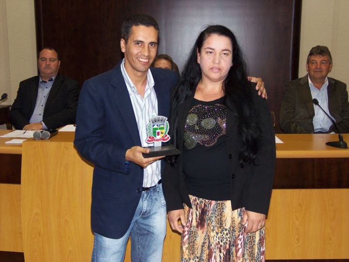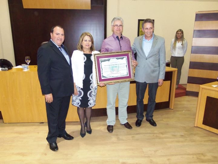 O prefeito Loreno Tolardo e o presidente da Câmara Antônio Cezar Totó Creplive entregam o Título Reconhecimento Público a empresa Pastre, receberam a honraria os empresários Lausane Pastre e Lauro Pastre Junior