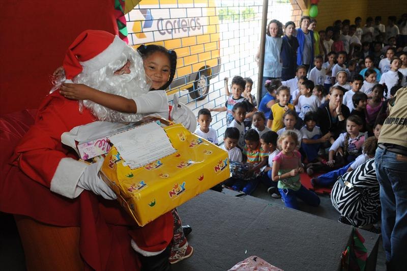 CURITIBA – Cartas escritas ao Papai Noel por 670 estudantes da Escola Municipal CEI Antônio Pietruza, no Tatuquara, tiveram resposta na tarde desta quinta-feira (11). Pedidos como bolas, biclicletas, bonecas e centenas de outros brinquedos foram todos atendidos e entregues para as crianças. Os presentes foram o resultado da Campanha Papai Noel dos Correios, que neste ano mobilizou padrinhos que ofereceram presentes para 11.154 estudantes de 37 escolas e Centros Municipais de Educação Infantil (CMEIs) da rede municipal de ensino.