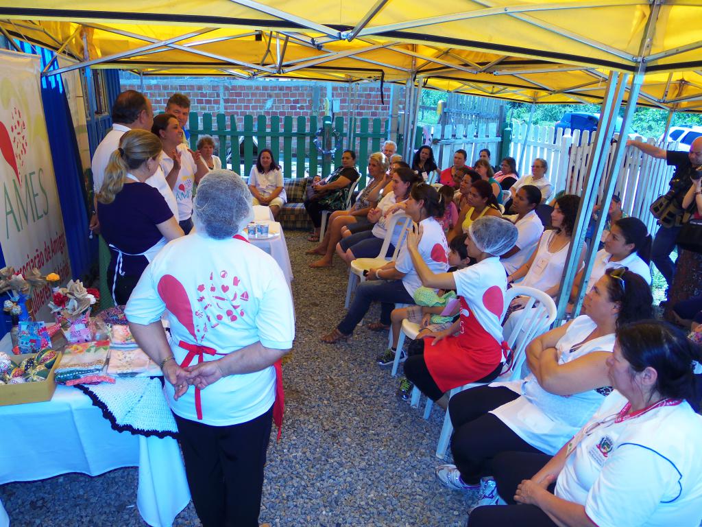 Lucinéia Alves coordenadora da AMES explica que a ONG surgiu em 2013 com a necessidade de realizar um trabalho junto às mulheres do bairro. “Através do Grupo Amigos em Ação já realizávamos ações voltadas às crianças, mas eu e a Marinalva tínhamos um projeto de estender esse trabalho para as mulheres da comunidade, era um projeto pra longo prazo. Em 2013 nós participamos de uma oficina da Regina Tchelly no Limoeiro em Curitiba e ficamos encantadas, ela mostrou para nós que era possível fazer, que não precisávamos esperar por recursos. Imediatamente após conversarmos com ela já abrimos a ONG que agora já está completando dois anos. Então, para nós, a vinda dela aqui hoje é muito importante, ela traz muitos conhecimentos que está passando para as mulheres da comunidade”, afirma Lucinéia.