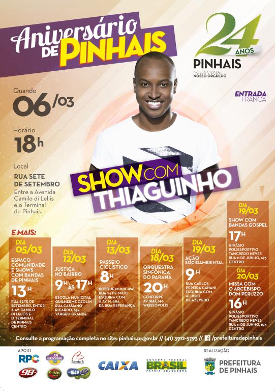 No próximo domingo, dia 6 de março, com sua “ousadia e alegria” o cantor Thiaguinho estará à frente de um show muito especial e pra lá de animado. Esta grande festa celebrará os 24 anos de emancipação política do município de Pinhais.