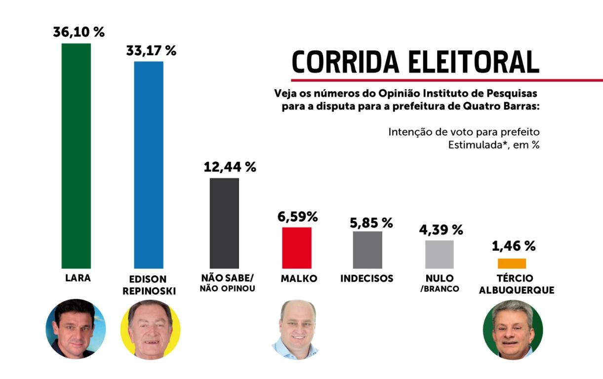 A Pesquisa encomendada pela L V Comunicação Integrada, foi realizada pela Opinião Instituto de Pesquisa e aponta Angelo Andreatta – Lara (PMDB) com 36,10% da intenção dos votos, Edison Repinoski (PSD) com 33,17% das intenções de votos,  José Carlos Malko (PDT) com 6,59% da intenção de votos e Tércio Albuquerque (PPS) com 1,46% de intenção dos votos. Não sabem/não opinaram 12,44%. Indecisos 5.85%, nulo/branco 4.39%. De acordo com os entrevistados pelo instituto entorno de 18,29% dos eleitores de Quatro Barras ainda não sabem ou não opinaram em quem votar neste domingo dois de outubro.