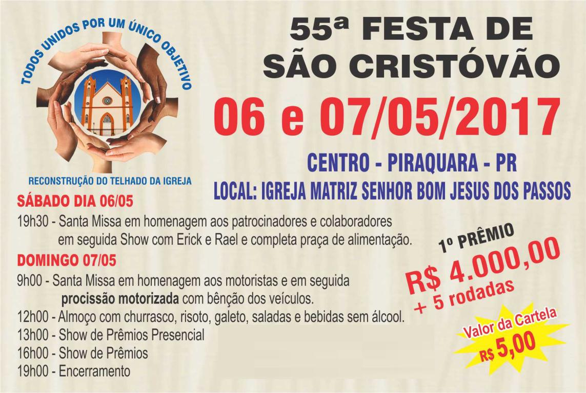 Em sua 55ª edição, a Festa será realizada na Igreja Matriz Senhor Bom Jesus dos Passos, no Centro de Piraquara. Neste ano, a celebração também tem o propósito de arrecadar fundos para a reconstrução do telhado da igreja.