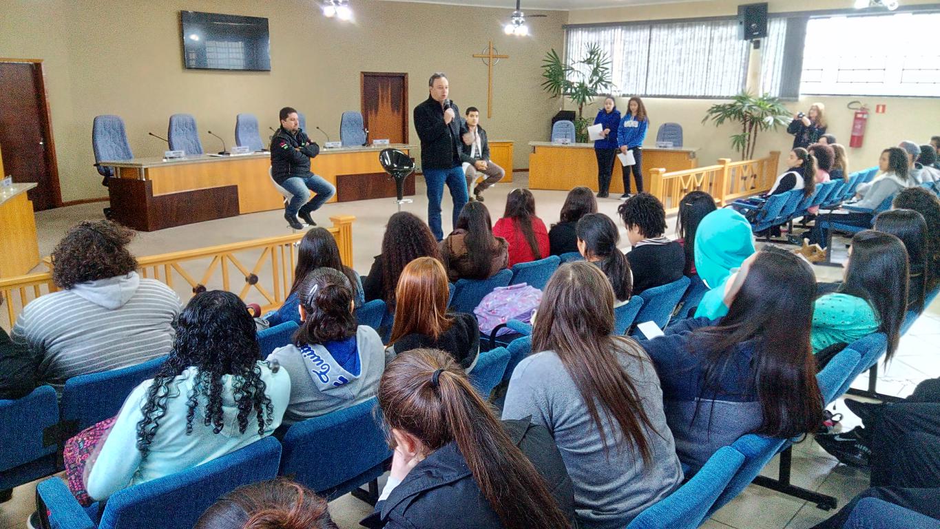 Alunos do 2° e 3° Anos do Colégio Estadual Timbú, situado no Eugênia Maria, lotaram o plenário da Câmara de Vereadores de Campina Grande do Sul na quinta-feira (6), para sabatinar o prefeito Bihl Zanetti e o presidente da Câmara, vereador Sergio Cavagni. O projeto: “Conversa Franca com o prefeito e o presidente da Câmara”, faz parte da disciplina de português. Entre as perguntas estavam temas sobre: educação, saúde, transporte, segurança e temas corriqueiros do dia a dia e a vida pessoal do prefeito e do vereador. O médico clínico geral Dr. Renan Martins da Silva, que atende na unidade de saúde do Caic também participou do debate respondendo aos questionamentos com relação à saúde na adolescência, doenças sexualmente transmissíveis e métodos preventivos.