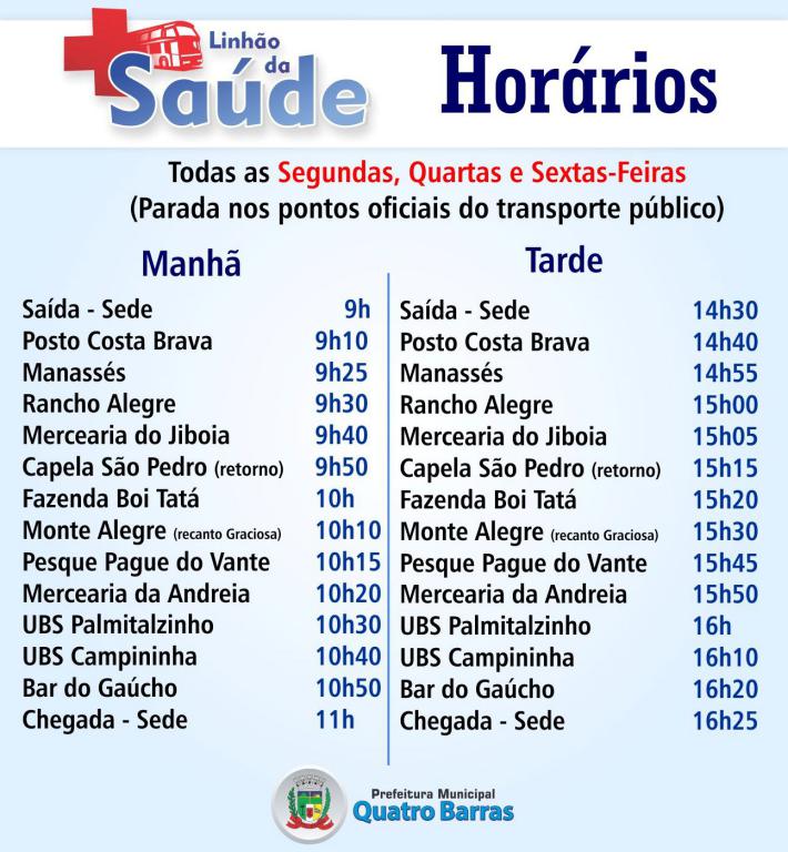 Com a proposta de facilitar e ampliar o atendimento de saúde oferecido às comunidades rurais, a Prefeitura de Quatro Barras implantou desde a segunda-feira (18) o Linhão da Saúde – um transporte gratuito que ligará as Unidades da Sede, Campininha e Palmital, facilitando o acesso da população a serviços como a retirada de medicamentos controlados, marcação de exames e o atendimento em consultas especializadas.
