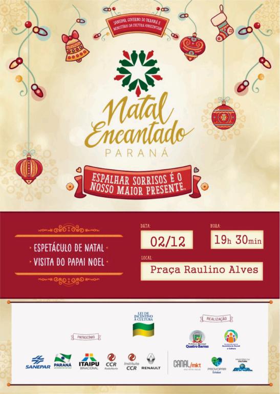 Quatro Barras recebe neste sábado (2) uma programação natalina toda especial: é o Natal Encantado, um evento que tem a parceria do Provopar e da Prefeitura Municipal. O público que comparecer à Praça Raulino Alves Cordeiro, no Centro, verá carretas iluminadas e belos espetáculos natalinos.
