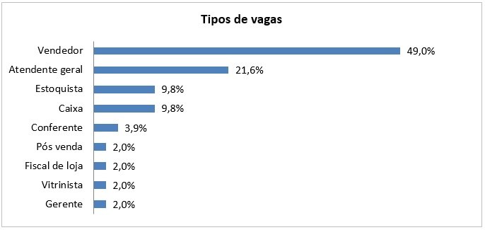 As contratações vão se concentrar na função de vendedor, com 49%, para dar conta do fluxo adicional de consumidores durante o Natal e festas de fim de ano. Também devem ser criadas vagas temporárias para atendente geral (12,6%), estoquista (9,8%) e caixa (9,8%).