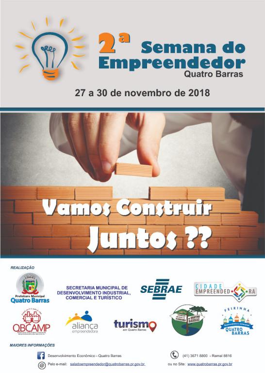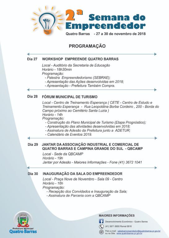 A 2ª Semana do Empreendedor é uma realização da Secretaria Municipal de Desenvolvimento Industrial, Comercial e Turístico. Mais informações, basta entrar em contato pelo telefone: (41) 3671-8800, ramal 8816, ou então pelo e-mail saladoempreendedor@quatrobarras.pr.gov.br. Participe!
