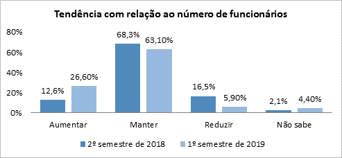 Os empresários também pretendem contratar mais em 2019. A parcela de empresas que planeja aumentar o número de colaboradores passou de 12,6% no 2º semestre de 2018 para 26,6% neste semestre. Já 63,1% intencionam manter o quadro funcional e apenas 5,9% deverá reduzir sua força de trabalho. No 2º semestre do ano passado, a parcela de empresas que pretendiam fazer demissões era de 16,5%.