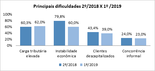 As preocupações dos empresários também tiveram mudança. Na edição anterior da pesquisa, a maior dificuldade relatada era a instabilidade econômica, que passou de 79,8% para 60% neste semestre. Atualmente, o empresariado se mostra mais preocupado com a carga tributária elevada (62%).
