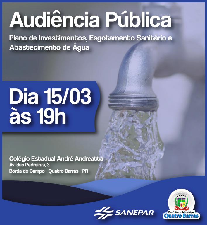 A Companhia de Saneamento do Paraná (Sanepar) realiza nesta sexta-feira (15) uma audiência pública para tratar sobre questões como abastecimento de água, esgotamento sanitário e plano de investimentos no município de Quatro Barras.