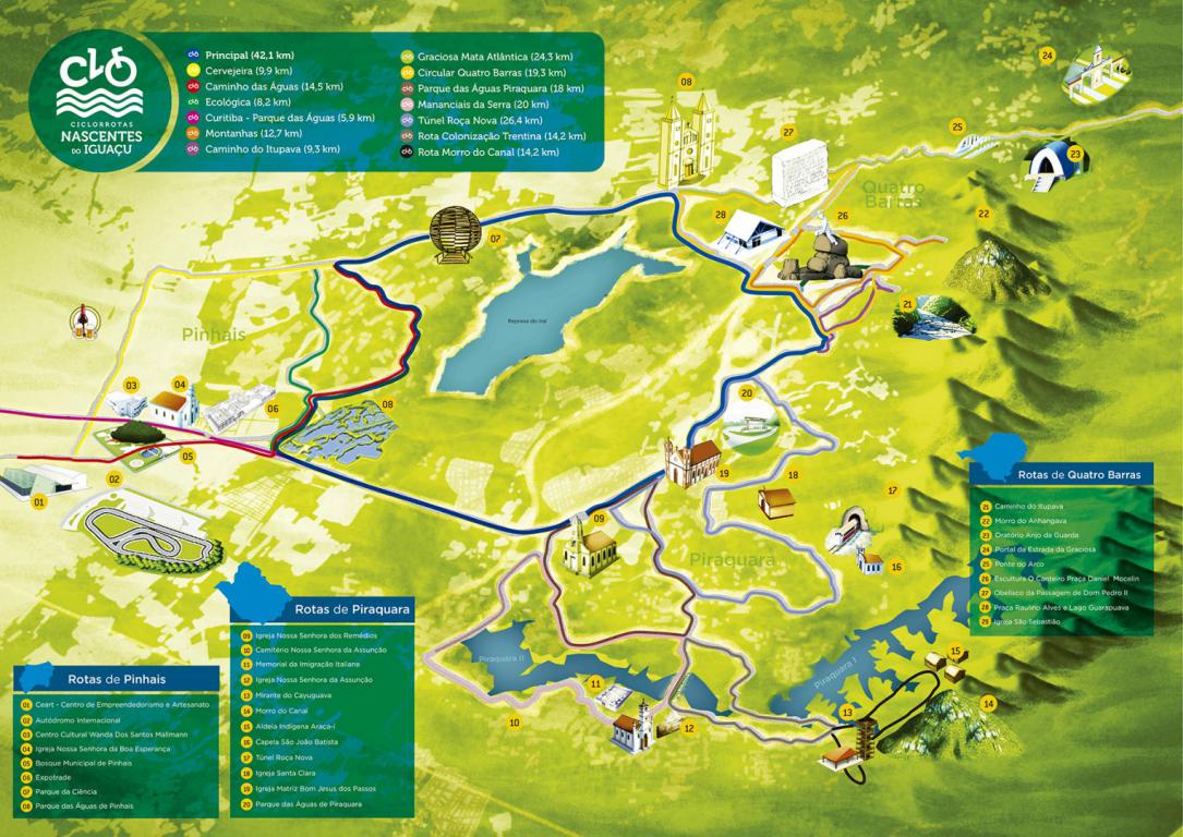 Inspirados no cicloturismo europeu que promove o turismo local com uma série de serviços, Pinhais, Piraquara e Quatro Barras, cidades da Região Metropolitana de Curitiba (RMC) conhecidas por belas paisagens naturais e um amplo circuito turístico, unem forças e criam a Ciclorrotas Nascentes do Iguaçu. Com 42,1 quilômetros de extensão, o circuito é composto por florestas, campos, várzeas e montanhas que guardam a pureza das águas que abastecem a grande Curitiba, formando o gigante Rio Iguaçu.