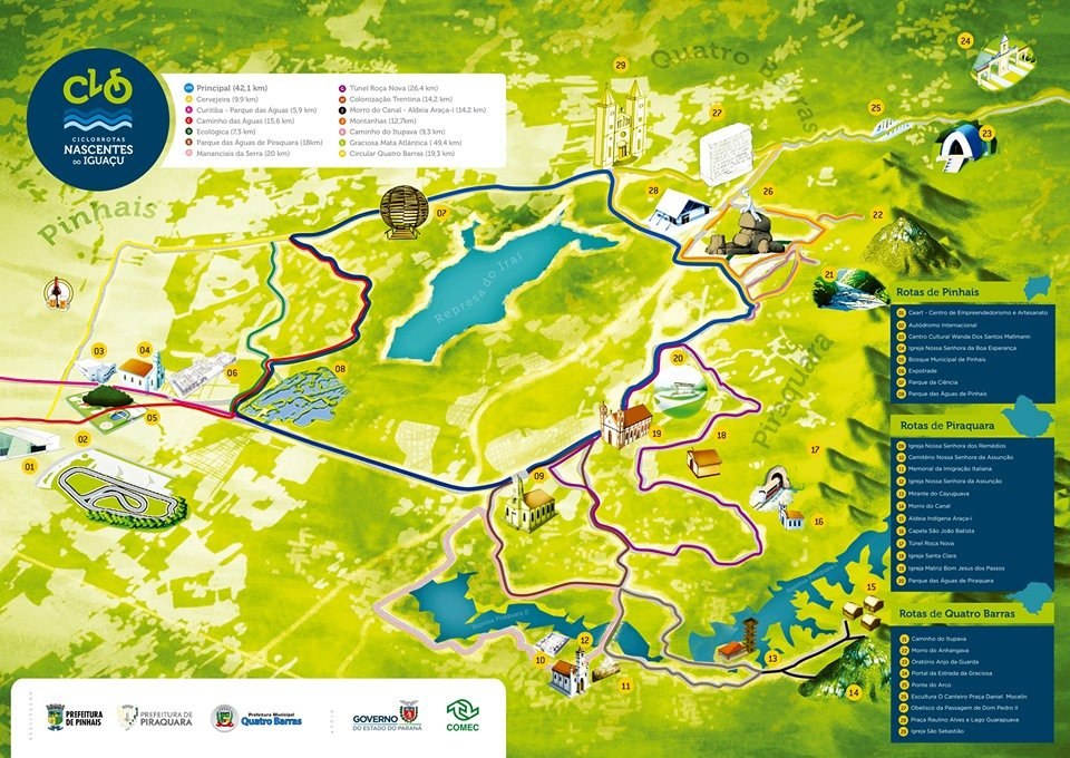 As Ciclorrotas Nascentes do Iguaçu tem 257 quilômetros de extensão e há também rotas menores. O circuito é composto por florestas, campos, várzeas e montanhas que guardam a pureza das águas que abastecem Curitiba e Região Metropolitana, formando o gigante Rio Iguaçu. O circuito conta com trechos asfaltados, estrada de chão, outros pisos e elevação variada, proporcionando mais ação ao turismo. O projeto foi pensado para atrair não somente ciclistas, mas também corredores, caminhantes e turistas que terão a oportunidade de conhecer vários pontos turísticos e as belezas naturais de Pinhais, Piraquara e Quatro Barras.