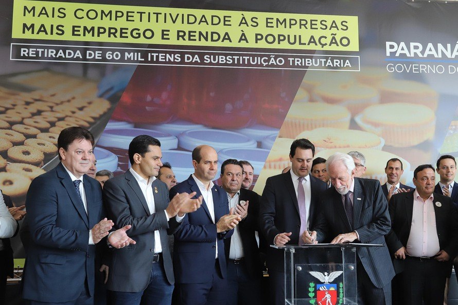 O governador Carlos Massa Ratinho Junior assinou nesta terça-feira (10) decreto determinando a retirada de mais de 60 mil itens do setor de alimentos do regime de Substituição Tributária (ST). A medida entrará em vigor a partir de 1º de novembro e vai beneficiar o setor produtivo, garantindo mais competitividade às empresas paranaenses. A solenidade de assinatura foi no Palácio Iguaçu com a presença de empresários e dirigentes de entidades do setor produtivo.