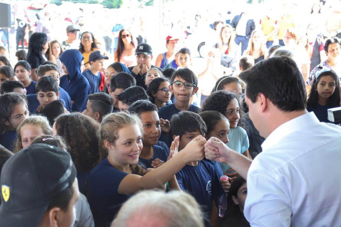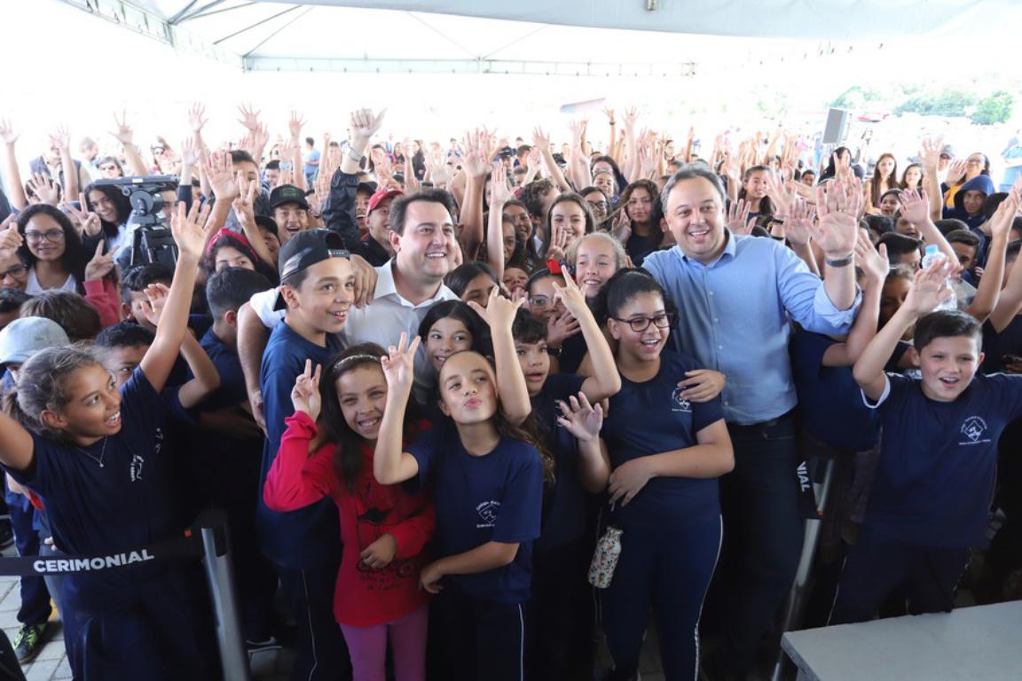 “Foi construída uma escola grande, com laboratórios de física e informática, toda ela modernizada para atender os projetos que estamos implantando na educação do Paraná”, afirmou Ratinho Junior. Ele citou programas como o Ganhando o Mundo, de intercâmbio, que começa a ser implantado neste ano e que vai oferecer bolsas de estudos nos Estados Unidos, Canadá e Inglaterra a alunos da rede estadual.
