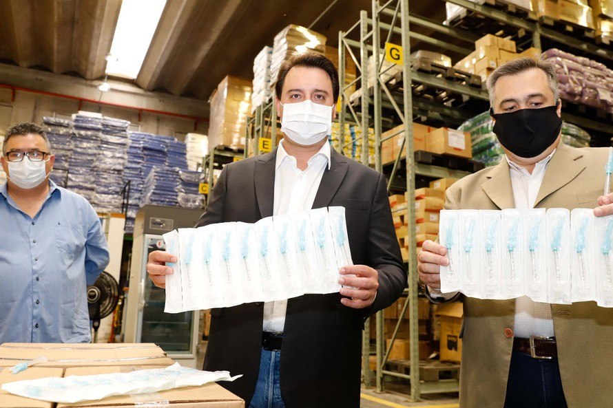 O governador Carlos Massa Ratinho Junior vistoriou nesta quarta-feira (12) o estoque dos chamados insumos secos que o Paraná já tem disponível para iniciar o processo de vacinação contra a Covid-19. São agulhas, seringas, máscaras, luvas, aventais e algodão, entre outros itens, que estão centralizados em dois pontos principais em Curitiba: o Centro de Medicamentos do Paraná (Cemepar) e o Ginásio de Esportes do Tarumã.