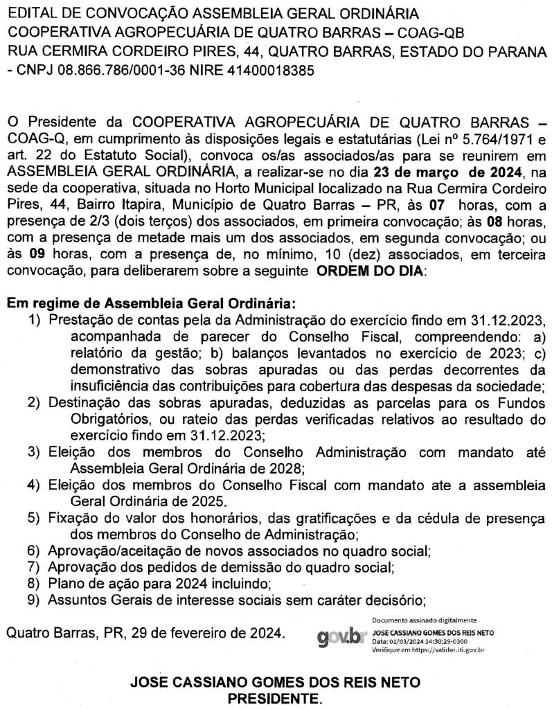 Edital Edital de Convocação Assembleia Geral Ordinária Cooperativa Agropecuária de Quatro Barras Publicado em 6 de março de 2024 Por facedanoticia Tags: Click para comentar Tendência Cidades3 dias atrás Deputada Marli Paulino protocola projeto para prevenção e combate a falsificação e adulteração de bebidas