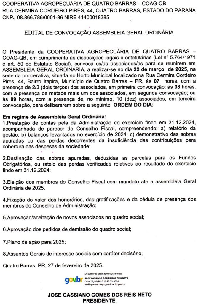 Edital COAG-QB – Edital de Convocação Assembleia Geral Ordinária Publicado em 10 de março de 2025 Por facedanoticia Tags: Click para comentar Tendência Cidades7 dias atrás Deputada Marli Paulino protocola projeto para prevenção e combate a falsificação e adulteração de bebidas