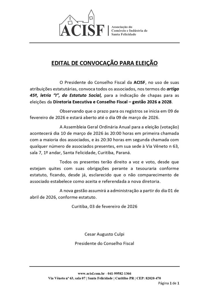 O Presidente do Conselho Fiscal da ACISF, no uso de suas atribuições estatutárias, convoca todos os associados, nos termos do artigo 45º, letria “I”, do Estatuto Social, para a indicação de chapas para as eleições da Diretoria Executiva e Conselho Fiscal – gestão 2026 a 2028.
